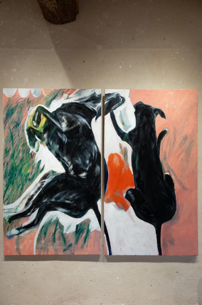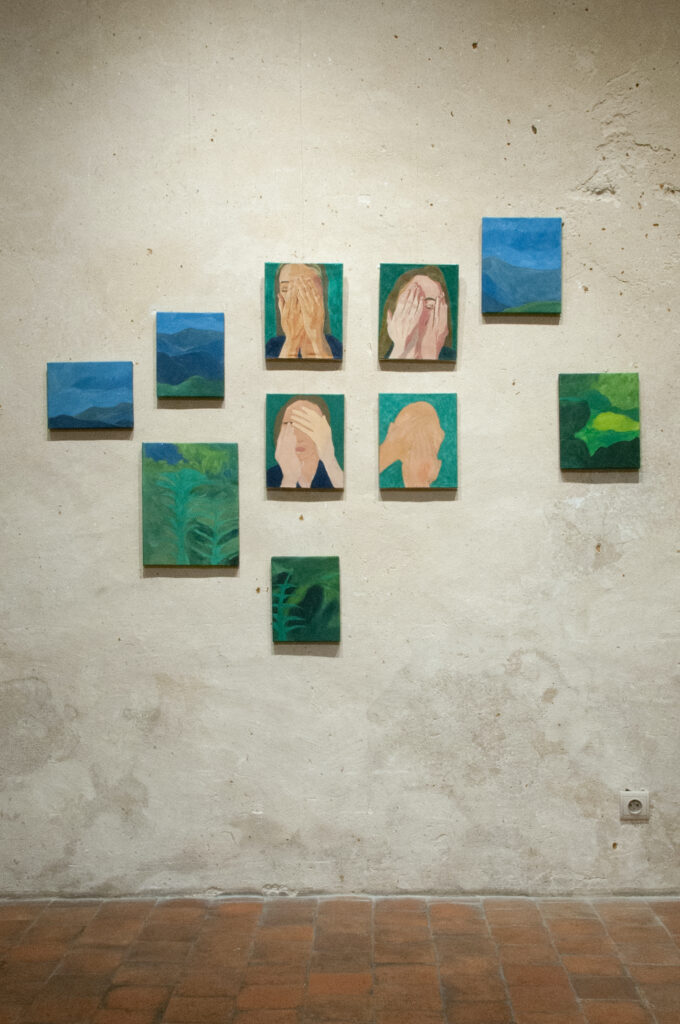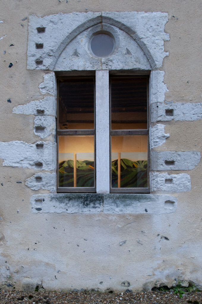 FR : J’envisage le tableau comme une scène : surface travaillée, mais aussi fragment d’architecture, décor dans le décor, ouverture sur un autre espace. Posées sur un tabouret, insérées dans une alcôve ou suspendues au cœur d’un paysage, mes toiles ne se conçoivent jamais comme de simples images, mais comme des présences qui se réorganisent dans leur environnement.