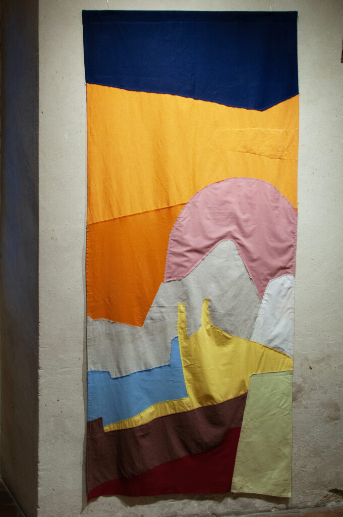EN : Sophie Balkanski is a painter and scenographer who is particularly interested in the materiality of painting. Her work unfolds within a tangible and fleeting universe where matter is painted, woven, and assembled. Collage plays a key role in her early explorations, where painting and textile installation converge. Her patchworks echo her background in theatre, where space, texture, and color intersect.