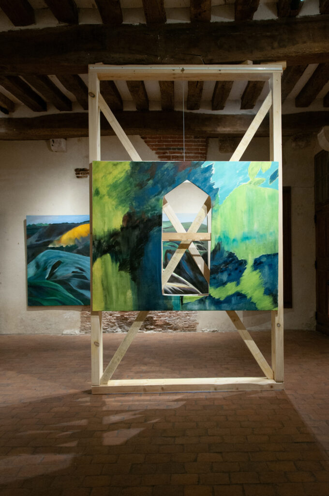 EN : I envision the painting as a stage: a worked surface, but also a fragment of architecture, a set within a set, an opening onto another space. Placed on a stool, set into an alcove, or suspended at the heart of a landscape, my canvases are never conceived as mere images, but as presences that reorganize themselves within their environment.
